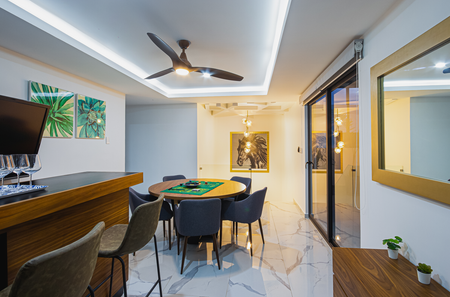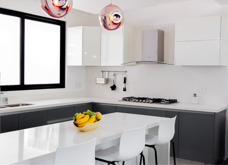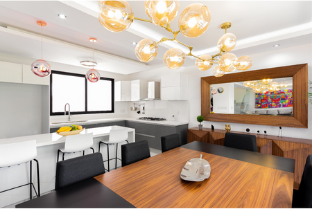 - Cocina integral equipada (con meseta de cuarzo y equipo de cocina: Horno, parrilla 6 quemadores y campana marca Mabe).