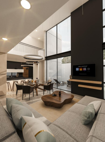 Residencias de arquitectura moderna y luminosa , con elegante sala comedor a doble altura, con amplios ventanales con vista al jardín y piscina.