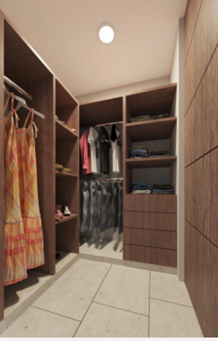 Recámara principal con balcón, con closet vestidor y baño con doble lavabo.