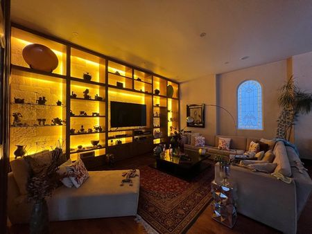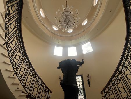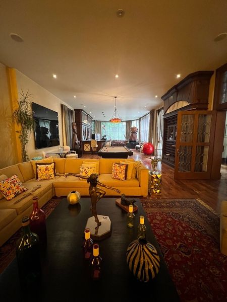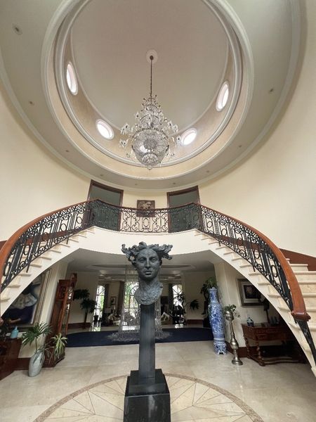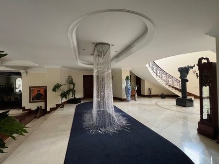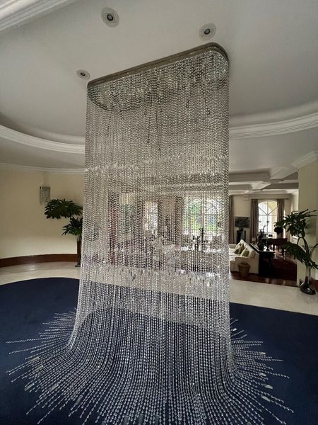 Estancia con techos a doble altura y en el centro tiene una lampara de cristal de techo a piso
