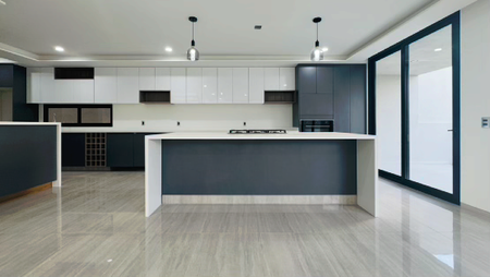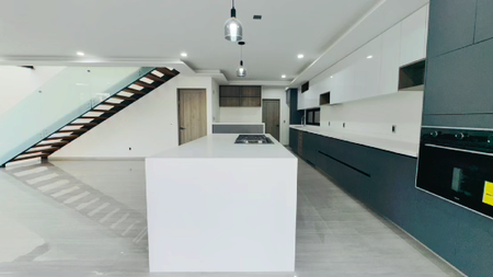 Cocina equipada con isla, parrilla, campana, horno y amplia alacena