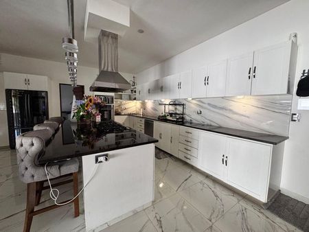 Amplia cocina equipada con meseta de granito e isla, gavetas incluidas, parrilla, lavavajillas, horno y campana.