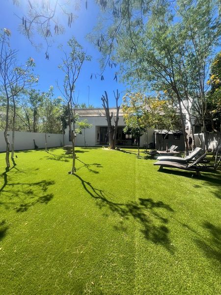 Jardín con pasto artificial de alta calidad, estético y de bajo mantenimiento.