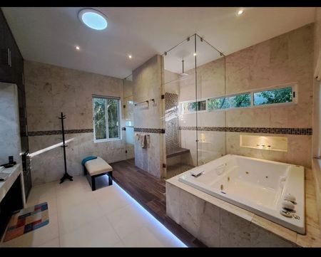Terraza techada que da a la alberca, jacuzzi dividido en agua fría y caliente, horno de leña, asador, amplia parrilla.