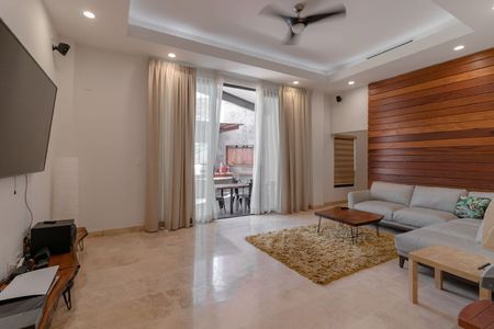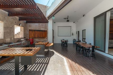 Jardin con área social con asadores, cocina exterior súper equipada, proyector y sonido surround .