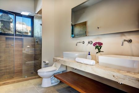 Estos nuevos departamentos de 2 y 3 habitaciones, así como los penthouses exclusivos, cuentan con un amplio diseño de concepto abierto y reciben mucha luz caribeña. Tienen una cocina completamente equipada con cubiertas de granito, una zona de estar y comedor amueblada, y una zona de lavandería con lavadora y secadora. Todas las modernas residencias tienen una amplia terraza cubierta con mesa y sillas. Las habitaciones cuentan con clósets de madera y lujosos baños completos con lavabos dobles. Las exclusivas unidades de penthouse tienen una terraza privada en el rooftop con una tina estilo jacuzzi. Estos departamentos tienen pisos de cerámica y acabados de alta calidad que son duraderos y fáciles de mantener. Se ofrecen en venta amueblados y equipados con ventiladores de techo y aire acondicionado.