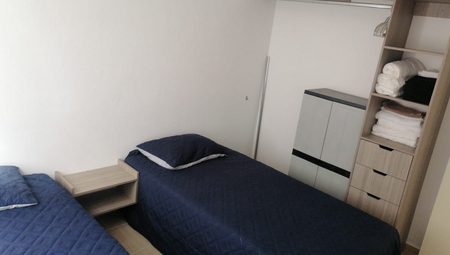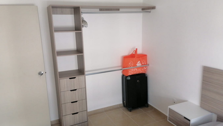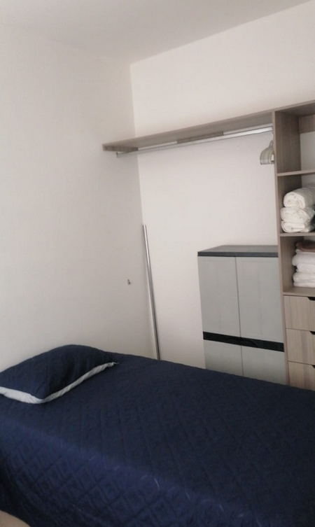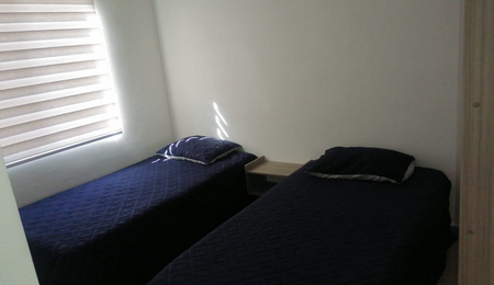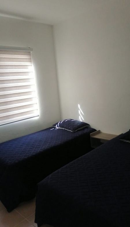 HABITACIÓN SECUNDARIA: Dos camas individuales, con un buró, clóset abierto con 4 cajones, cortina y accesorio de plástico para almacenamiento extra.
