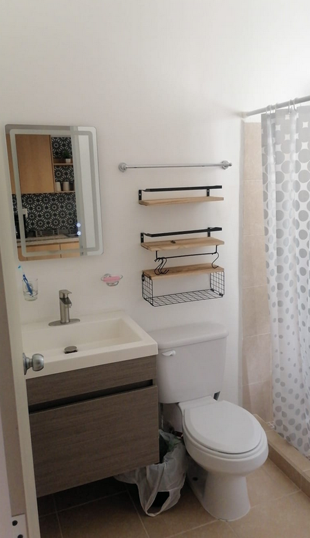 BAÑO: Mueble de baño, espejo, repisas decorativas, cortina de baño y sanitario.