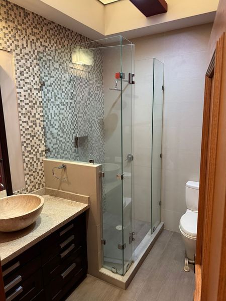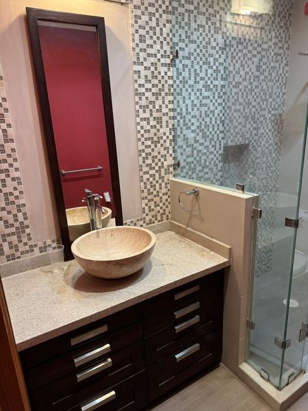 Cocina integral equipada con estufa empotrable, microondas, tarja de acero inoxidable doble tina, llave mezcladora satinada, barra desayunador con 5 bancos de madera incluidos.