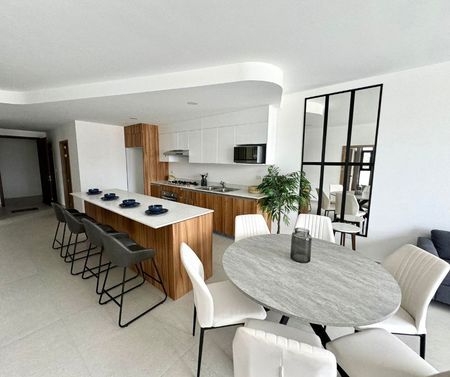 Cocina, fabricada a base de MDF con recubrimiento de melamina texturizada; cubierta de granito, tarja de acero inoxidable, horno de gas, parrilla de 6 quemadores, campana de filtro y horno de microondas.