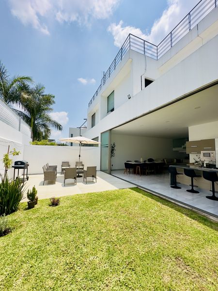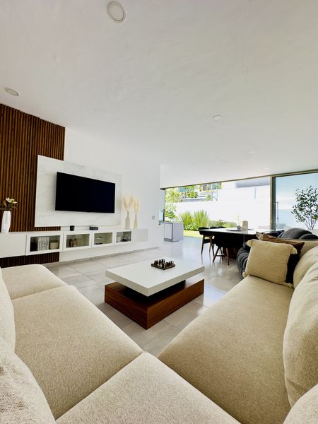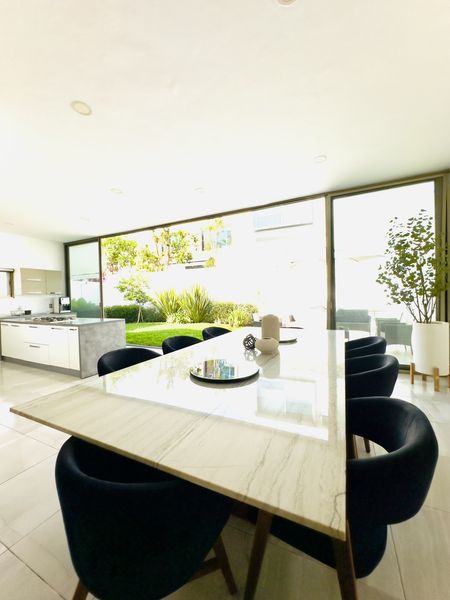 • Sala y comedor de gran amplitud con ventanales de cancel que se abren por completo, integrando el interior con el jardín
