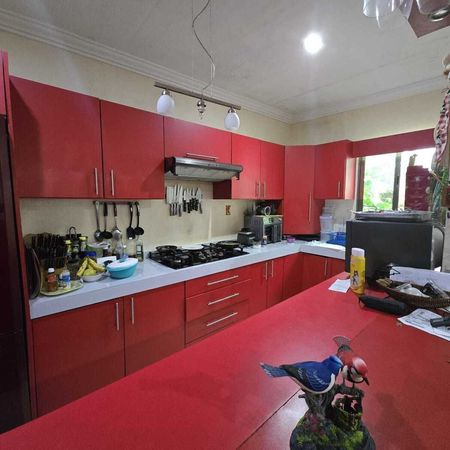 ⁃ Hermosa cocina totalmente equipada con muebles integrales, horno, parrilla, campana, refrigerador, equipada también con barra desayunadora tipo bar.