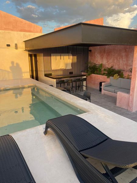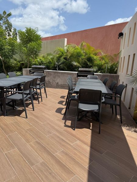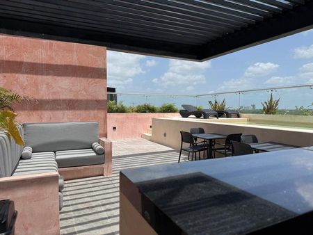 Departamento ubicado en condominio al norte de Mérida en Santa Gertrudis Copo, cuenta con lobby, gym, área de yoga, roof top con aberca, alberca con asoleadero en planta baja.