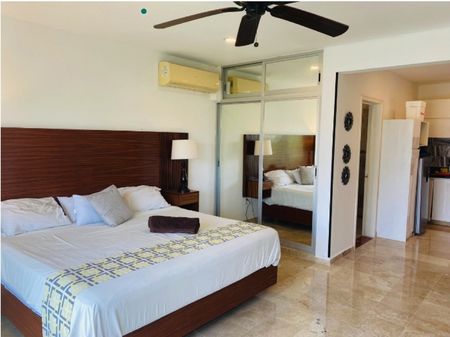 Este estudio en el 4º piso es ideal para rentas vacacionales o como su hogar en el paraíso. Cuenta con una distribución abierta y recibe mucha luz natural del Caribe. Tiene una cocina completamente equipada, una pequeña área de descanso con mesa y sillas, una cama king size y un armario. Se abre hacia un balcón privado con vistas a la ciudad y al mar. Este es un lugar encantador para disfrutar de su café matutino y desayuno, o de una copa de vino por la tarde. El departamento cuenta con pisos de loseta y acabados de alta calidad que son duraderos y fáciles de mantener. Se ofrece a la venta completamente amueblado y equipado con ventiladores de techo y aire acondicionado.