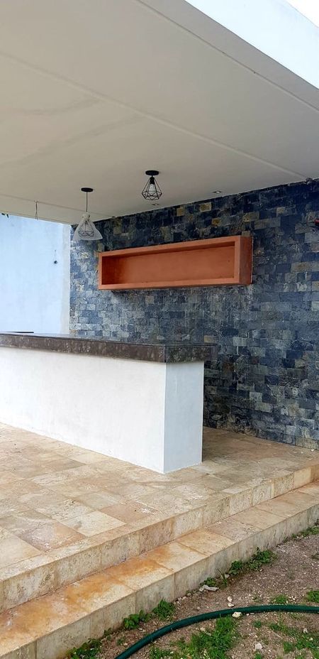 • Bar exterior amplio con recubrimiento de mármol travertino y en la barra mármol Santo Tomás.