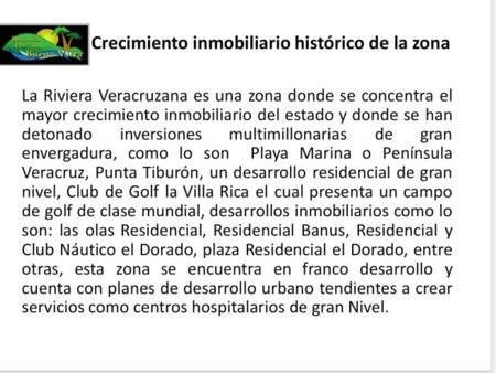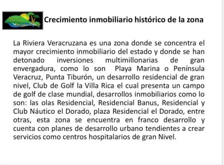 "En un rango no mayor a 10 km se encuentra el centro comercial el Dorado, súper mercados, plazas comerciales, centros náuticos, club de golf, gimnasios, centros educativos en todos sus niveles, asi como restaurantes sobre el Boulevard Riviera Veracruzana.