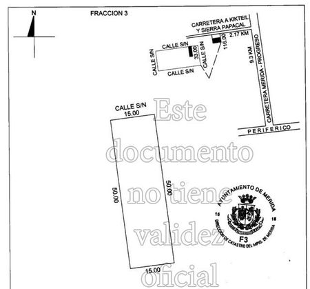 Terreno residencial en venta a solo 55 minutos de la carretera Mérida - Progreso; con 750 m2 de superficie total medidas de 15 x 50. La propiedad se encuentra a 2.7 km de la entrada principal de la carretera Mérida - Sierra papacal; ubicada en zona de alta plusvalía y rápido crecimiento. Los servicios básicos se encuentran cercanos a la propiedad.