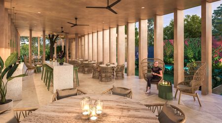 Terraza social con piscina con acabado Chukum, bar y 2 medio baños, bodega y caseta de vigilancia.