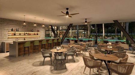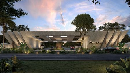 •Taj Casa Club con muros de piedra, paisajismo y espacios semiabiertos.