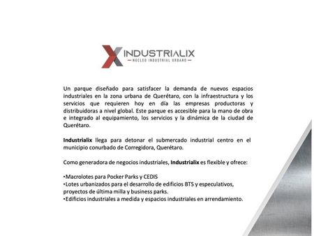 Industrialix llega para detonar el submercado industrial centro en el municipio conurbado de Corregidora, Querétaro.