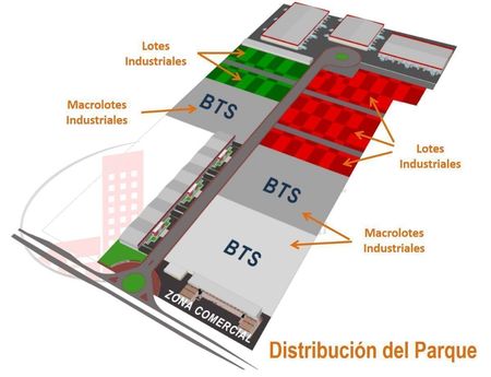 Parque industrial con uso de suelo para industria mediana, con renta y venta de bodegas y venta de lotes industriales.