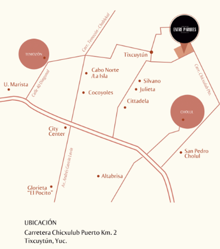 Entre Parques se encuentra ubicado al norte de la ciudad de Mérida en la zona de Tixcuytún, a corta distancia de las principales zonas comerciales y de servicios, pero a su vez separada del caos de la ciudad y rodeada de naturaleza.