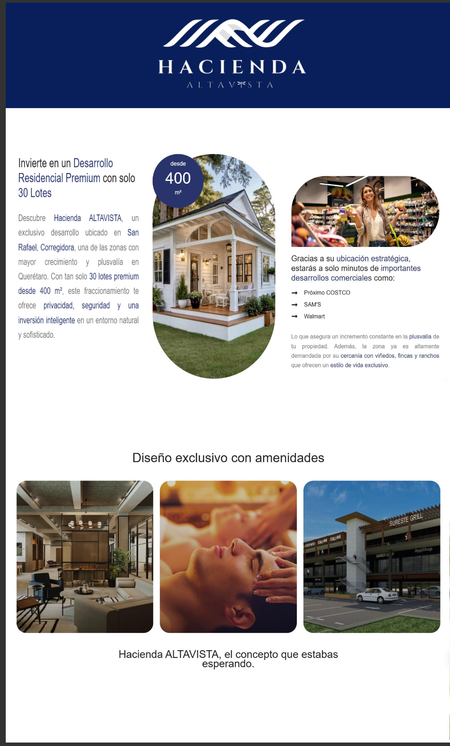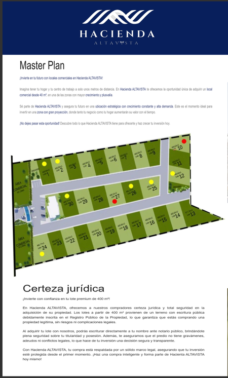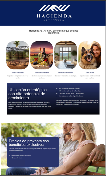 Imagina despertar con el canto de los pájaros, rodeado de viñedos, naturaleza y la paz del campo… pero a solo 10 minutos de la ciudad. En Hacienda ALTAVISTA, encontrarás lotes residenciales desde 400 m² en un desarrollo exclusivo de solo 30 familias.