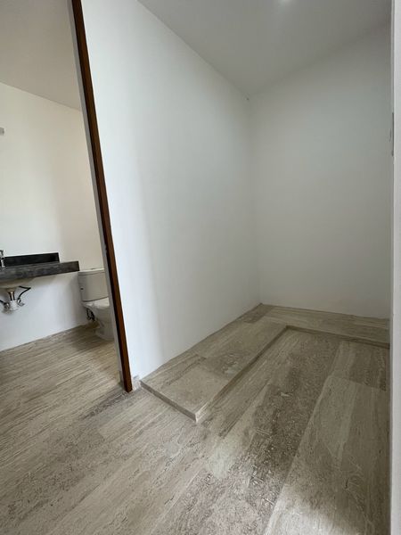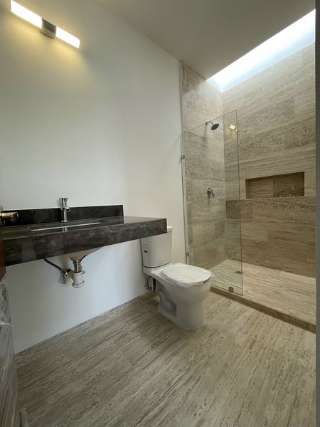 Recámara principal con espacio de closet vestidor, baño completo con doble lavamanos y balcón.