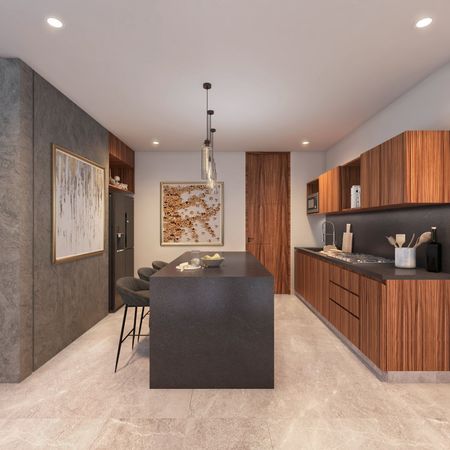 • Cocina con barra desayunadora tipo isla con mesetas en granito más área de alacena.