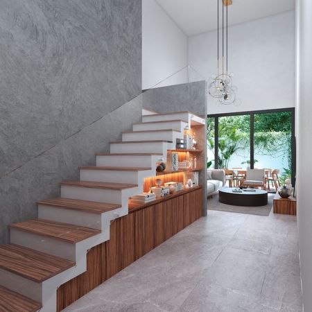 • Cochera techada para dos vehículos con piso de concreto estampado.