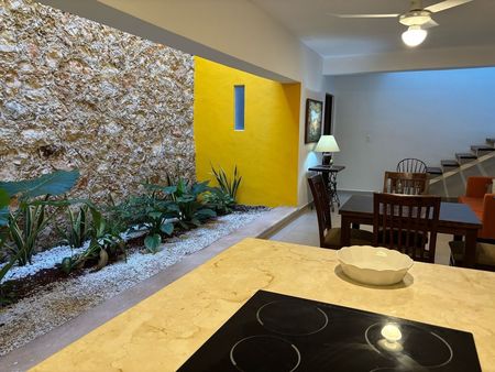 Cuenta con 2 recamaras 2 baños y medio sala comedor y cocina corridas, lavanderia con lavasecadora, la recamara principal con closet vestidor Y balcon. Jardín interior con hermoso diseño rústico colonial acorde con el diseño arquitectónico lo cual le da una agradable vista y luz natural a la planta baja.