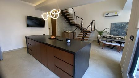 -Cocina integral, con Las encimeras e isleta están forradas con granito negro san Gabriel leather, asi como la carpintería con la que se encuentra conformada es de la más alta calidad lampara moderna que da una iluminación muy elegante