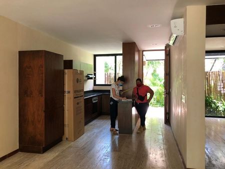 Bonito departamento en venta en Tulum zona de gran plusvalía en México. Cuenta con dos recámaras cada una con su baño, cocina, sala, comedor, terraza con pequeña alberca, área común con palapa y alberca. Totalmente listo para entregar. Nuevo con todas las garantías