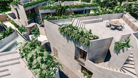 Estas hermosas villas de 2 pisos son perfectas para alquileres vacacionales o como tu propio hogar en el paraíso. Cuentan con un amplio diseño de concepto abierto con vistas expansivas de la alberca infinita y el jardín. Todas las modernas residencias tienen una cocina con isla, un cuarto de servicio y 3 recámaras con baños completos. La recámara principal tiene un vestidor y una terraza privada. Cuentan con un rooftop privado con alberca y un área multipropósito con cocina al aire libre, perfecta para el entretenimiento en días calurosos o noches relajadas. Estas villas cuentan con pisos de mármol, acabados naturales, iluminación LED, enchufes USB y sistemas de ahorro de energía. Se ofrecen a la venta sin amueblar pero equipadas con ventiladores de techo y aire acondicionado.