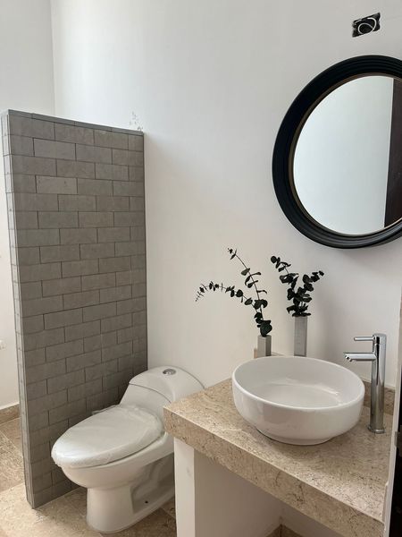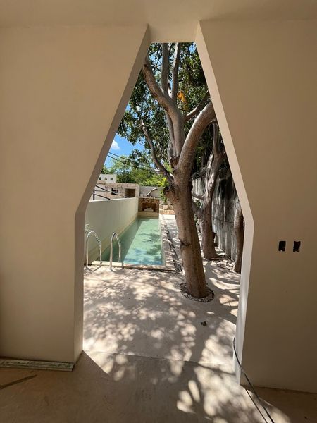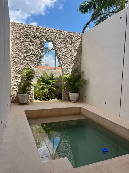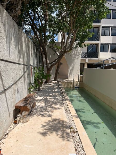 El edificio cuenta con elevador y tiene varias amenidades como piscina, canal de nado, terraza, roof top con bar, con jacuzzi y cada depa tiene una bodeguita y al menos un cajón de estacionamiento. Me gustaron sus acabados y los detalles padres como el arco maya y una copia del chac mool en el canal de nado, están super originales!