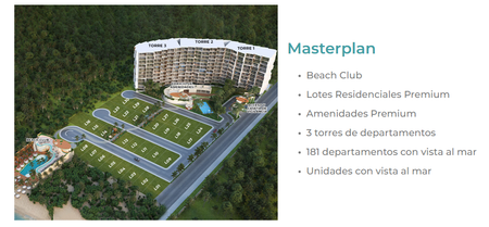 El proyecto consta de 31 Lotes residenciales con un promedio de 220 m2 de superficie, cada lote. 3 torres de departamento con 60 unidades casa una y diferentes modelos a su elección y Beach Club Privado.