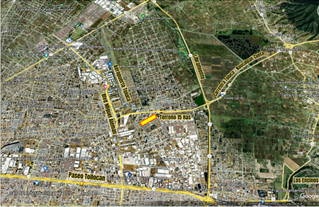 Terreno de 15 Has con uso de suelo Industrial. El terreno es rectangular, por lo que se facilita el diseño de cualquier proyecto de Naves Productivas. Ubicación inmejorable, cerca del aeropuerto de Toluca. Tres opciones para ir hacia la Ciudad de Mexico, Carretera Toluca-Mexico, Carretera Toluca-Naucalpan Cuota y Toluca-Naucalpan Libre. Ademas, cerca del Libramiento para ir hacia el Norte, via Atlacomulco y Queretaro.