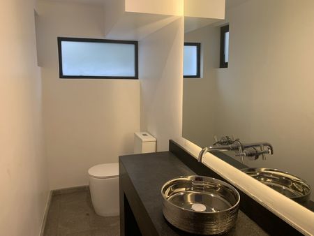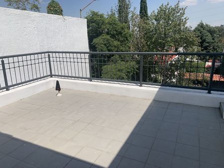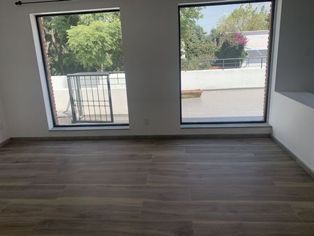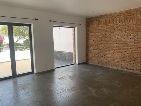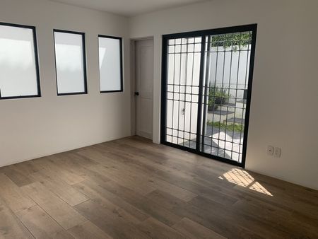 Departamento independiente para visitas o como estudio-consultorio, con sala-comedor, cocina abierta, dos recámaras con un baño y jardín.