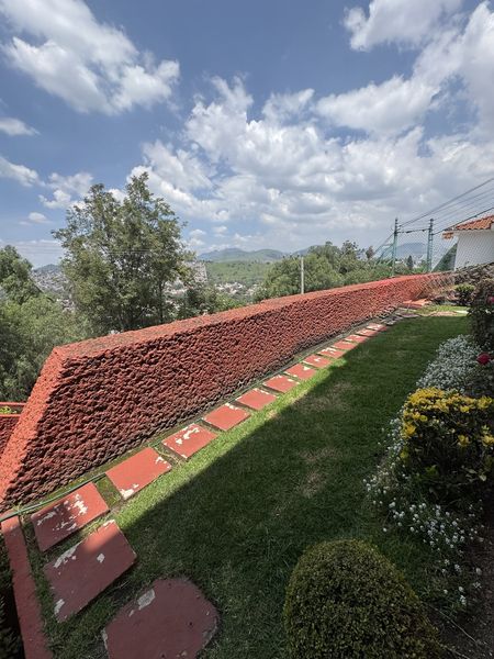 Estacionamiento comodo. contraste de pared rugosa de recinto de cantera con vegetación del lugar. Jardín frontal de vista profunda.