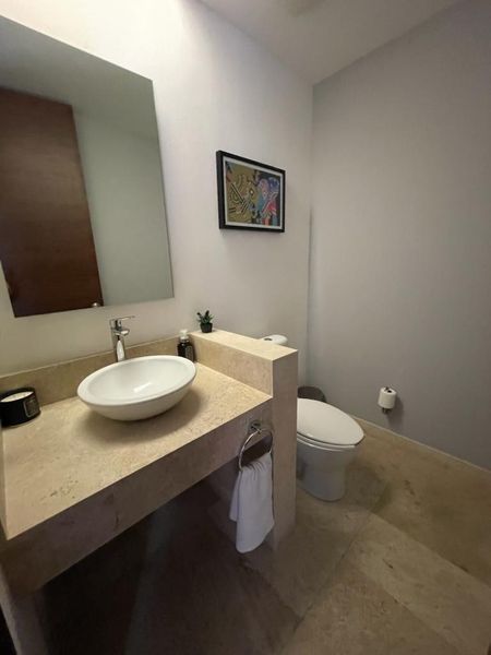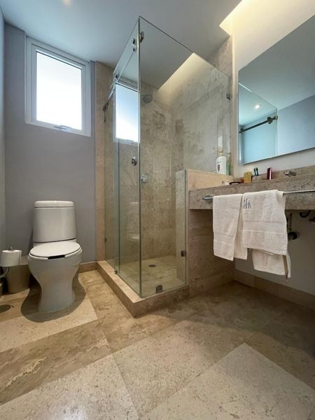 La estancia muuy iluminada con terraza de 30m, cocina súper moderna con cubierta de granito, 2 recámaras, ,2 baños, cuarto de servicio con baño, Bodega, 2 lugares de estacionamiento y estricta vigilancia.