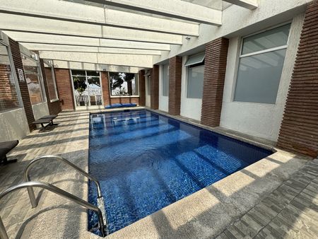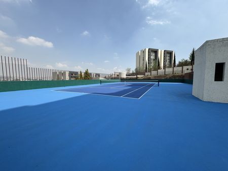 Tiene excelentes amenidades , cancha de tenis, cancha de pádel, alberca cubierta, gym, salón de fiestas y jardines con juegos para niños
