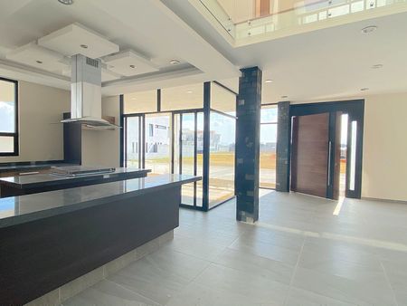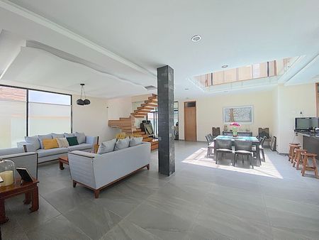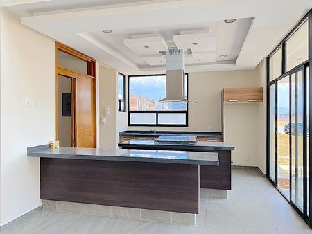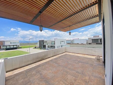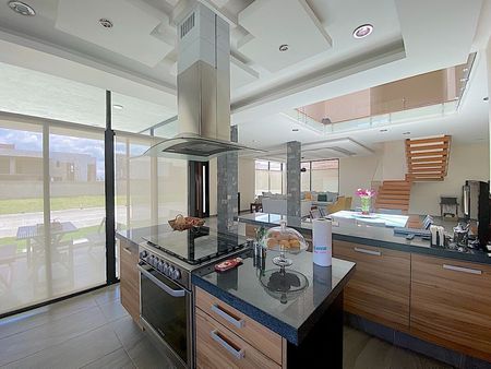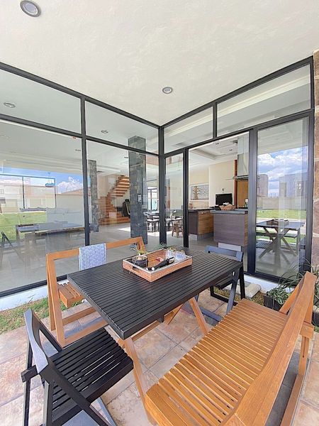 sala, comedor, estudio con ventanales de piso a techo, medio baño para visitas, moderna cocina abierta con barra e isla con estufa y cubiertas de granito, desayunador rodeado de ventanales de piso a techo, area de lavado y cuarto de servicio y amplias escaleras con barandal de cristal templado, para acceder al 1er nivel donde se encuentran, 2 recámaras secundarias cada una con baño y closet, la recamara con closet-vestidor, baño con tina, y el family. El family y la recamara principal tienen acceso a 1 amplia y acogedora terraza con pérgola.