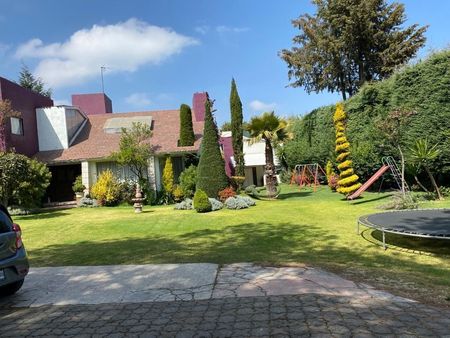 Jardín de 1,100 m2 en excelentes condiciones con área para juegos infantiles, asador y estacionamiento techado.