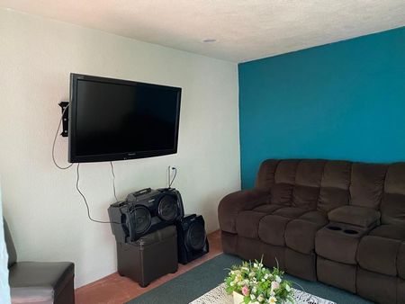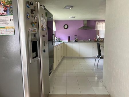 Sala en desnivel y con una hermosa jardinera, sala de TV, recámara para visitas y baño completo, espacio para comedor y amplia cocina integral con espacio para refrigerador grande, mesa desayunador y puerta de servicio hacia el área de lavado.