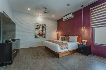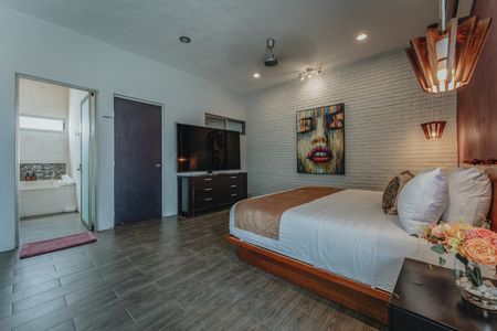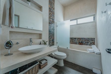 -Amplia habitación principal con baño propio, jacuzzi con acabado de chukum, cancel de vidrio templado y closet vestidor de gran tamaño.