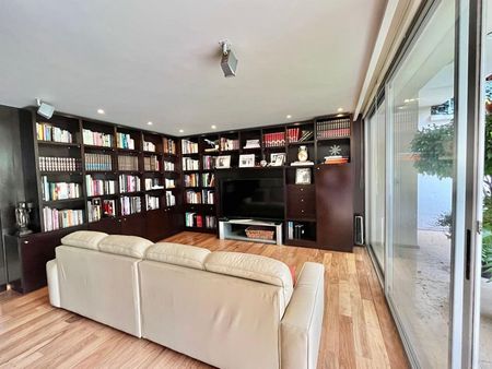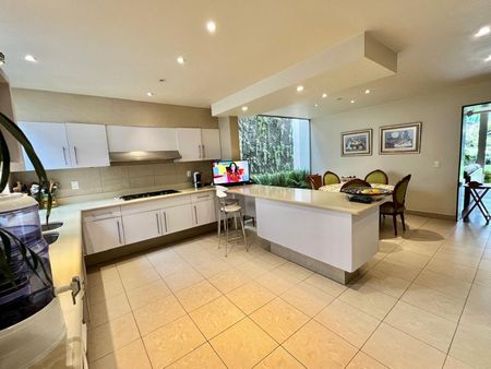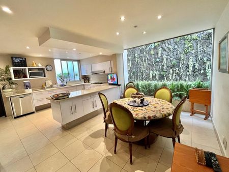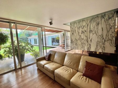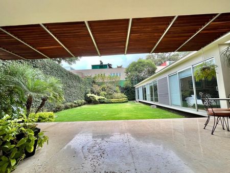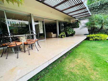 3 recámaras con baño, la principal con walk-in closet y sala de TV/estudio. Todas con salid a precioso y amplio jardín.