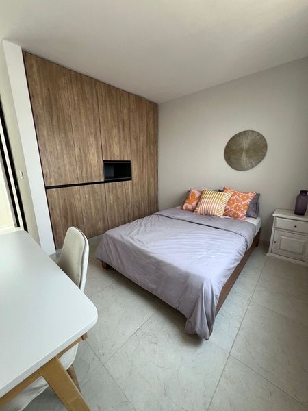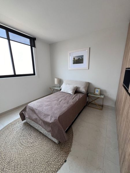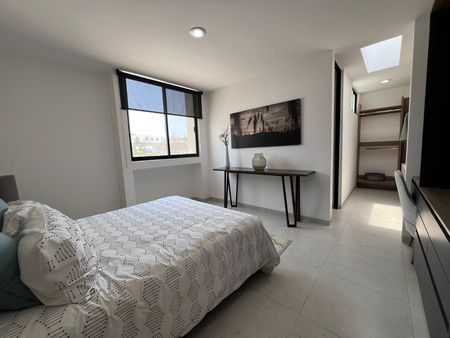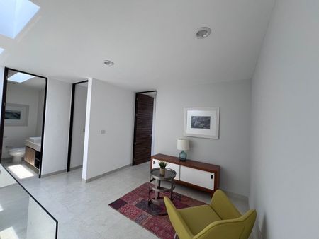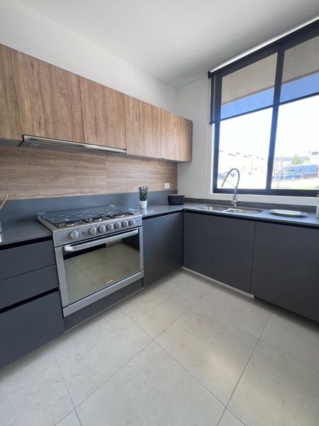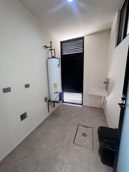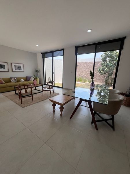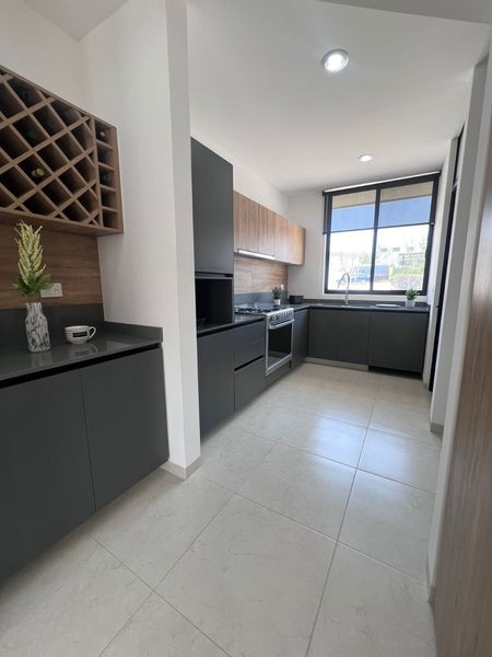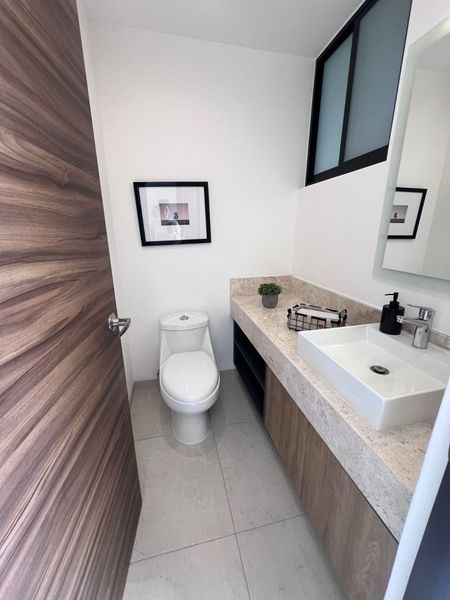 La recámara principal cuenta con vestidor y baño privado, 2 recámaras secundarias que comparten baño, en la planta alta tiene una estancia, en planta baja encontramos medio baño, sala, comedor, pequeño jardín trasero, cuarto de lavado, cocina equipada con acabos en cuarzo.