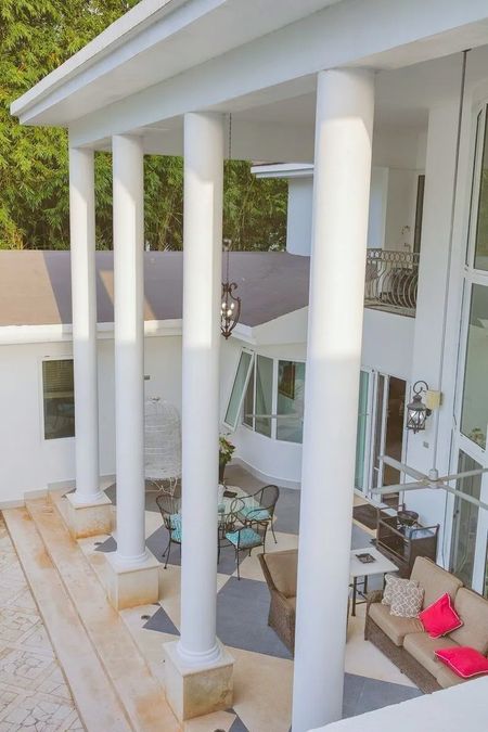 La casa es estilo americano y esta en excelente estado de mantenimiento. Además se encuentra rodeada de mucha vegetación y muchos árboles.