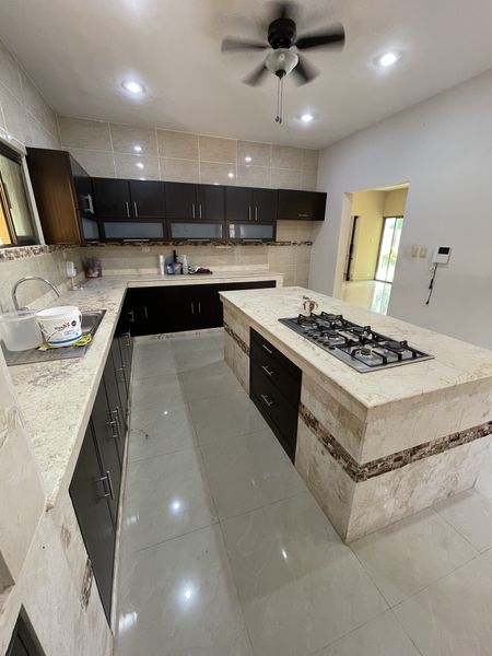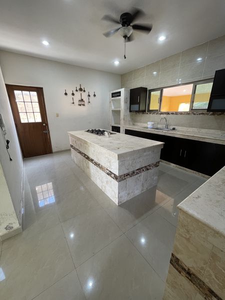 Amplia cocina equipada con estufa, barra de trabajo y con salida a pasillo de servicio.