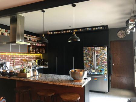 • Cocina abierta con barra de granito, estufa integrada y campana flotante.
